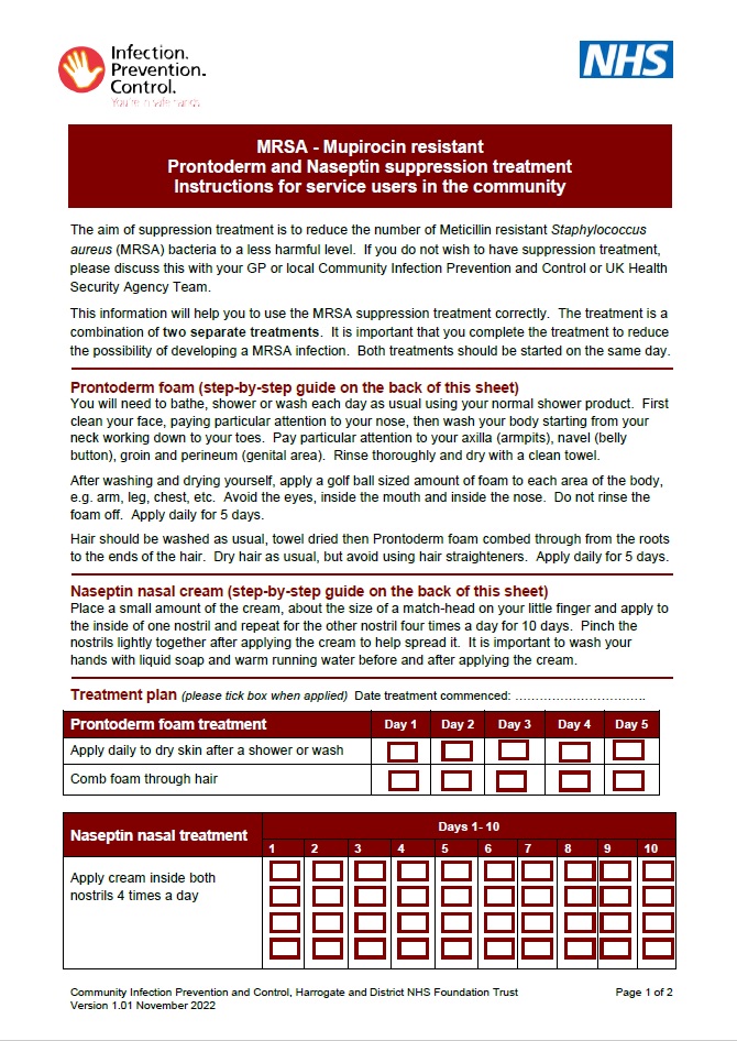 Step by step guide for service users in the community on MRSA Mupirocin resistant suppression treatment using Prontoderm foam and Naseptin nasal cream.